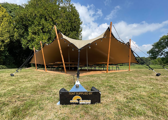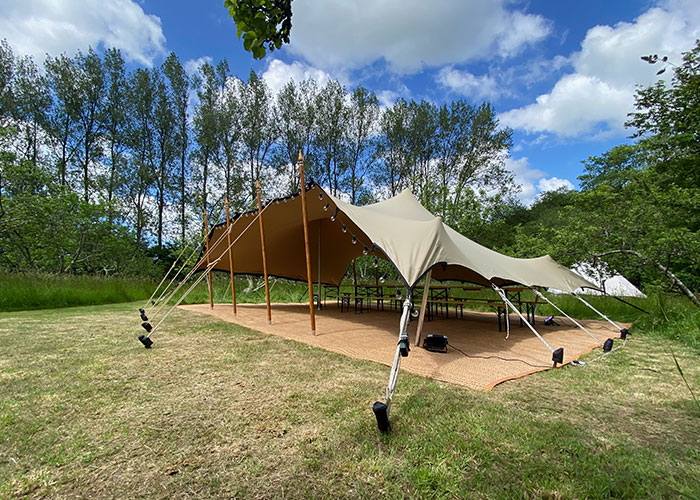 What makes the Stretch Tent unique is a combination of the stretch material and the way it is erected. Initially the tent is layed out and the corners pegged down. Then the poles are inserted from underneath pushing the fabric up. The poles can be placed anywhere and different lengths of poles can be used to achieve the desired space. This means the tent is very adaptable and the layout can be altered depending on the type of event and the weather conditions. If the weather is calm and sunny the sides can be placed on tall poles, if more shelter is needed the sides can be pegged right to the ground. If there is a tree right in the way of the entrance, the poles can be placed to one side.