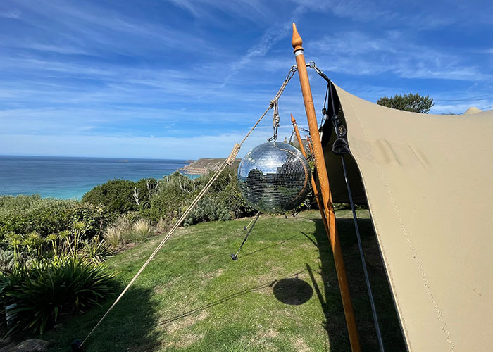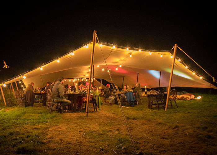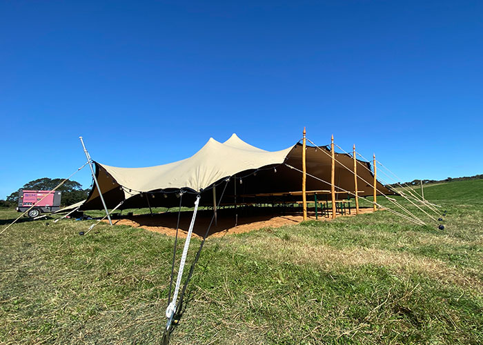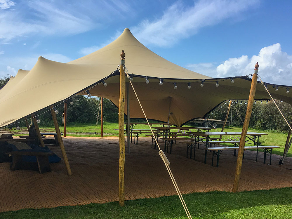 What makes the Stretch Tent unique is a combination of the stretch material and the way it is erected. Initially the tent is layed out and the corners pegged down. Then the poles are inserted from underneath pushing the fabric up. The poles can be placed anywhere and different lengths of poles can be used to achieve the desired space. This means the tent is very adaptable and the layout can be altered depending on the type of event and the weather conditions. If the weather is calm and sunny the sides can be placed on tall poles, if more shelter is needed the sides can be pegged right to the ground. If there is a tree right in the way of the entrance, the poles can be placed to one side.