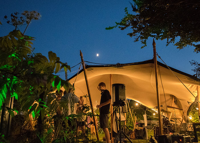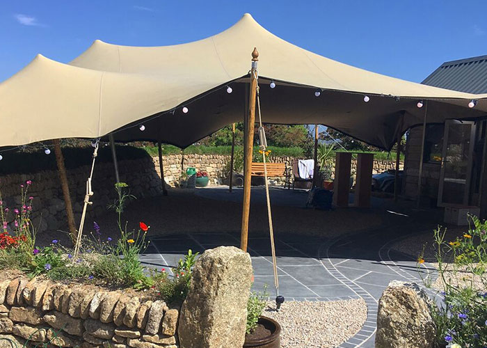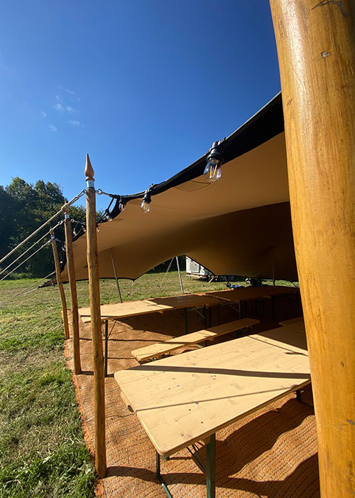What makes the Stretch Tent unique is a combination of the stretch material and the way it is erected. Initially the tent is layed out and the corners pegged down. Then the poles are inserted from underneath pushing the fabric up. The poles can be placed anywhere and different lengths of poles can be used to achieve the desired space. This means the tent is very adaptable and the layout can be altered depending on the type of event and the weather conditions. If the weather is calm and sunny the sides can be placed on tall poles, if more shelter is needed the sides can be pegged right to the ground. If there is a tree right in the way of the entrance, the poles can be placed to one side.